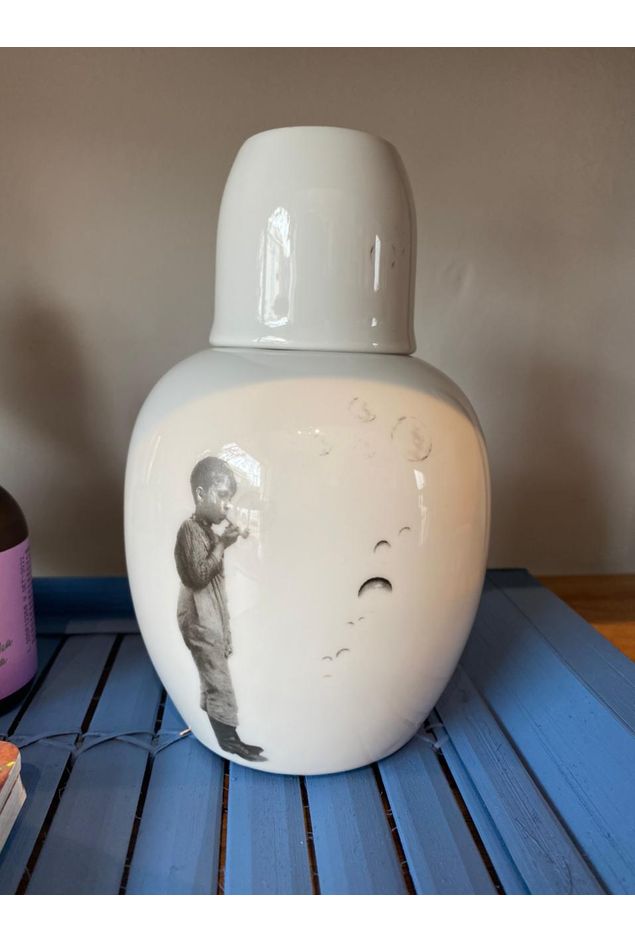 Moringa em porcelana, com tampa que também serve como copo, para armazenar sua água. A peça ainda recebe aplicação das artes do Greghi Design, que deixa tudo ainda mais especial. Que tal essa moringa pra decorar seu ambiente de trabalho ou seu quarto? Pense nela também como opção para dar um presente bem especial.