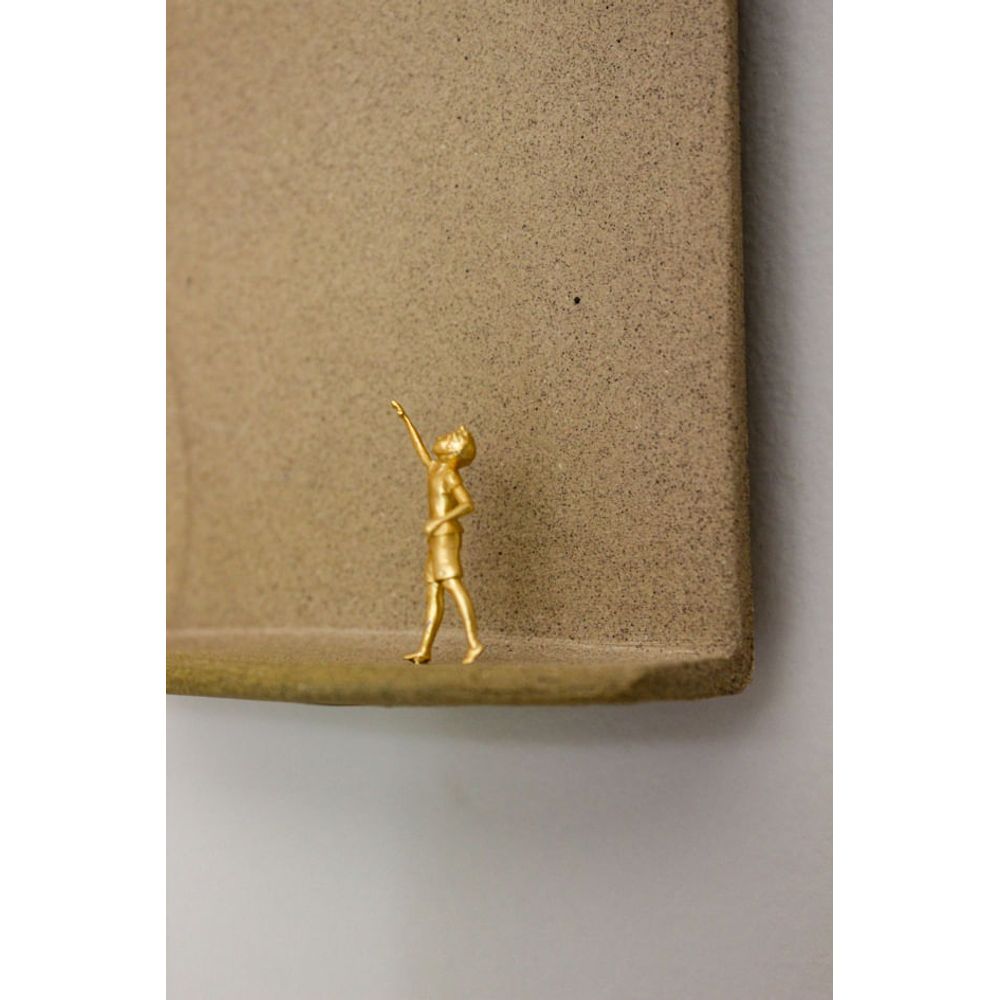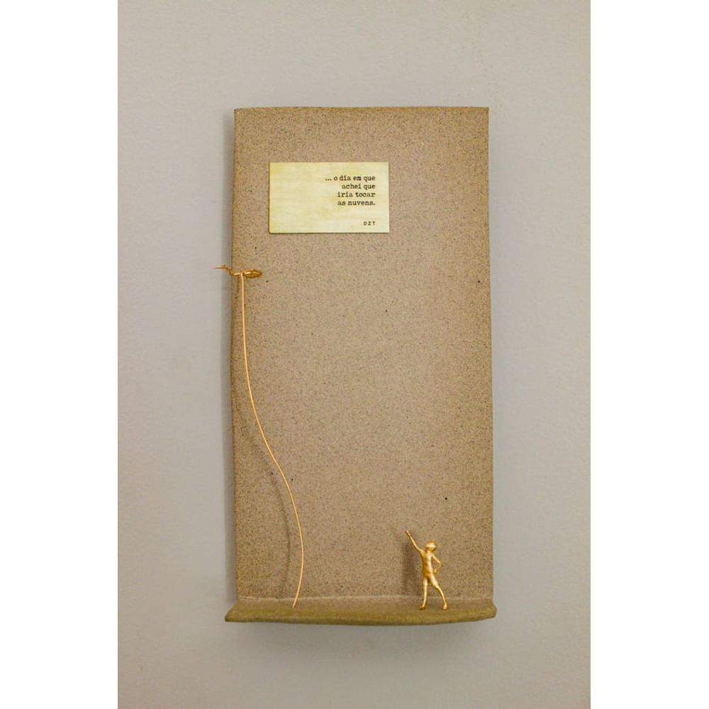Mundinho as nuvens é uma requintada escultura feito em cerâmica natural, a peça é composta pela miniatura de um menino com o braço apontado para cima, em direção a pipa com haste fina que sobrevoa, no topo a plaquinha dourada nos traz a frase (...o dia em que achei que iria tocar as nuvens.) nos revelando o sentimento e desejo de tocar as nuvens, todas as peças douradas são produzidas em latão banhados a ouro uma obra que desperta memórias, perfeita para compor ambientes inspiradores.