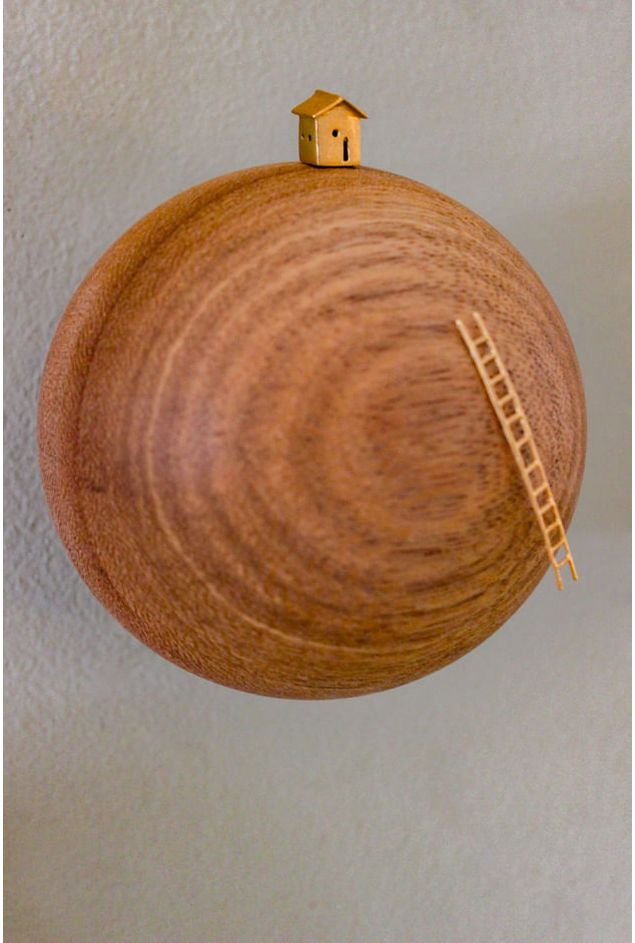 Mundinho habitar lugares G – capítulo II, é uma peça artística com textura natural de madeira em formato de esfera, composta pela miniatura de uma bela casinha dourada sobre o topo da peça, acompanhada de uma escada que alcança até a casinha, um cenário de leveza e reflexão da arte, ideal para decorar ambientes rústicos e sofisticados, a harmonia entre os tons da peça a levam a ser versátil para decorações, nos convidando a contemplar os desejos de alcançar sonhos e espaços.