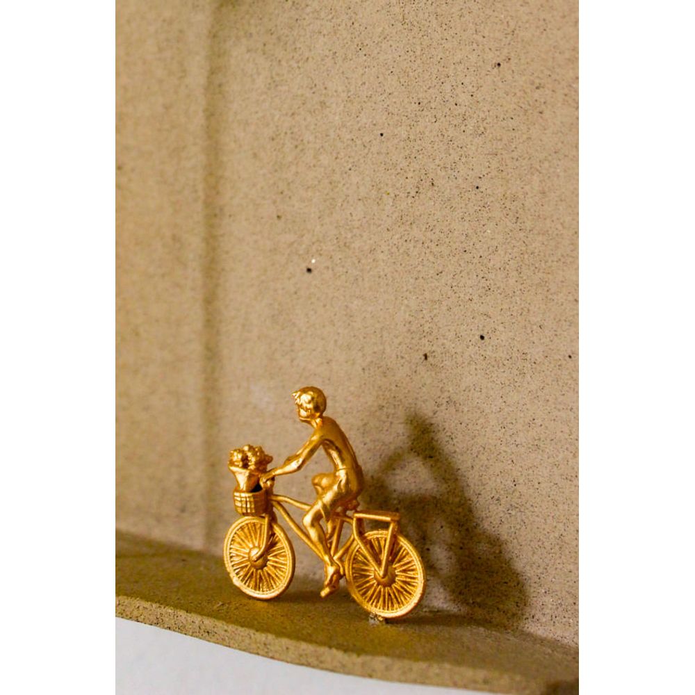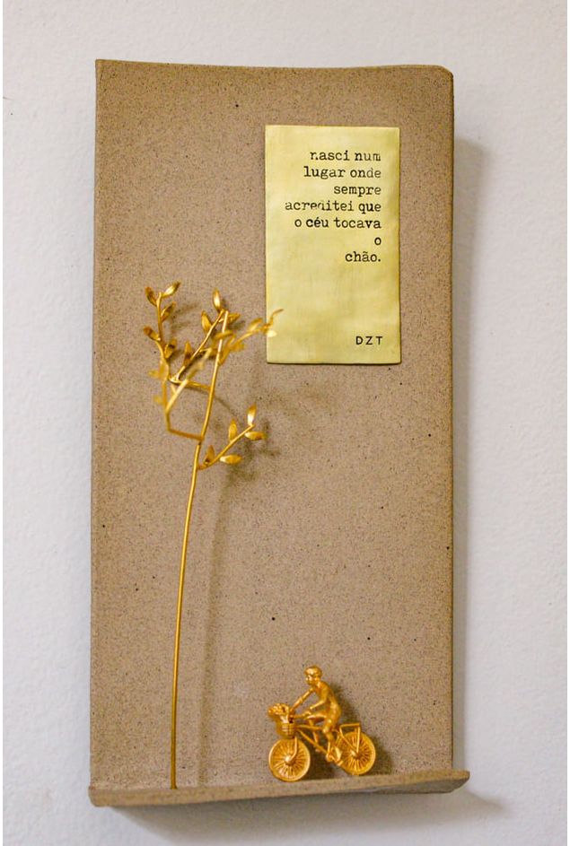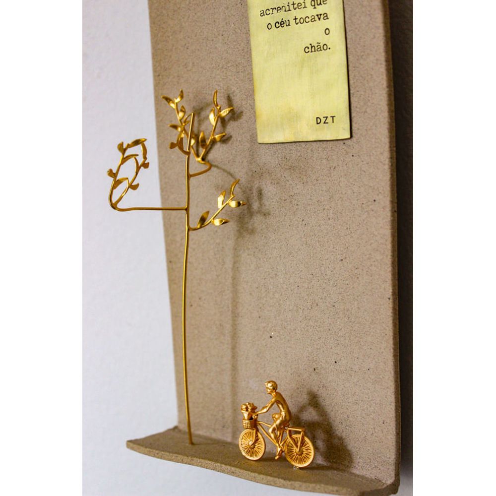 Mundinho lugar onde vivi é uma escultura feita em cerâmica natural, a peça é composta pela cena de uma figura pedalando em sua bicicleta carregando flores no cesto, á sua frente uma árvore de galhos dourada, banhada a ouro, no topo a plaquinha dourada nos traz a frase (Nasci num lugar onde sempre acreditei que o céu tocava o chão), nos revelando o sentimento e desejo de voltar para casa, todas as peças douradas são produzidas em latão banhados a ouro, uma obra que desperta memórias afetivas, perfeita para compor ambientes inspiradores.
