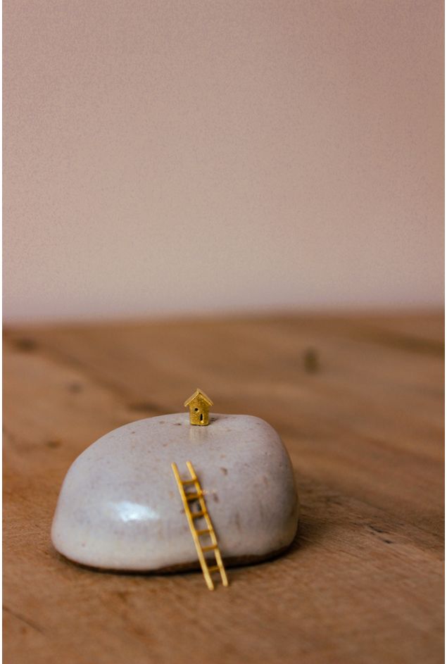 Escultura decorativa feita de cerâmica de alta temperatura (granito com pintas) e esmaltação branca rústica, com detalhes em latão banhados a ouro. Feita pelas talentosas mãos do Gabriel, que mistura técnicas de joalheria de bancada e muita poesia, cada mundinho representa uma lembrança, um sentimento. Essa peça conta com uma mini casinha e uma escadinha que leva à casa.