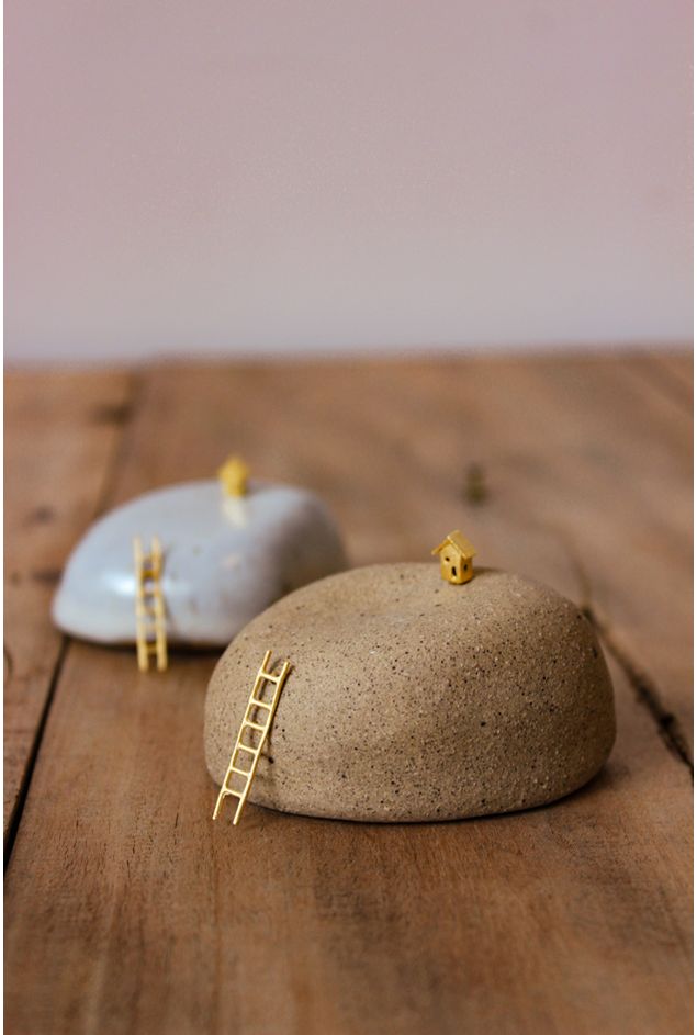 Escultura decorativa feita de cerâmica de alta temperatura (granito com pintas cru), com detalhes em latão banhados a ouro. Feita pelas talentosas mãos do Gabriel, que mistura técnicas de joalheria de bancada e muita poesia, cada mundinho representa uma lembrança, um sentimento. Essa peça conta com uma mini casinha e uma escadinha que leva à casa. Poesia em cada detalhe.