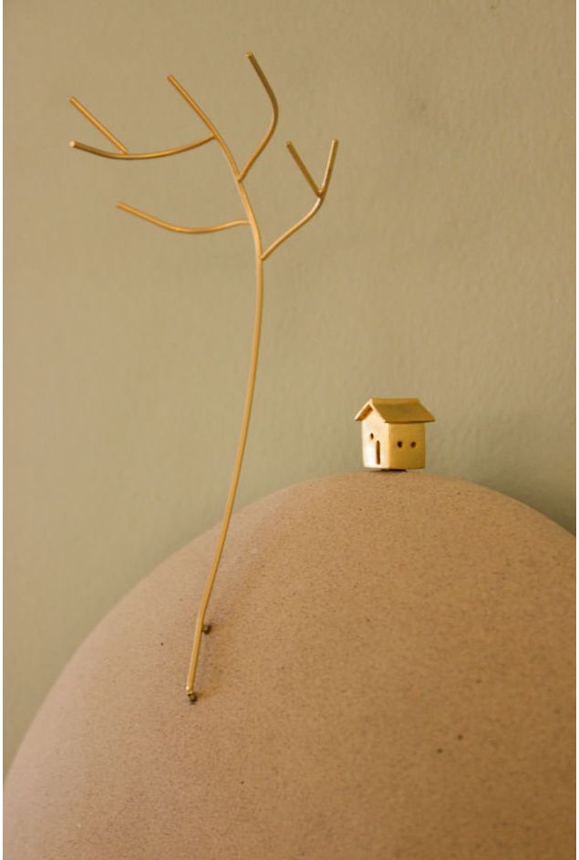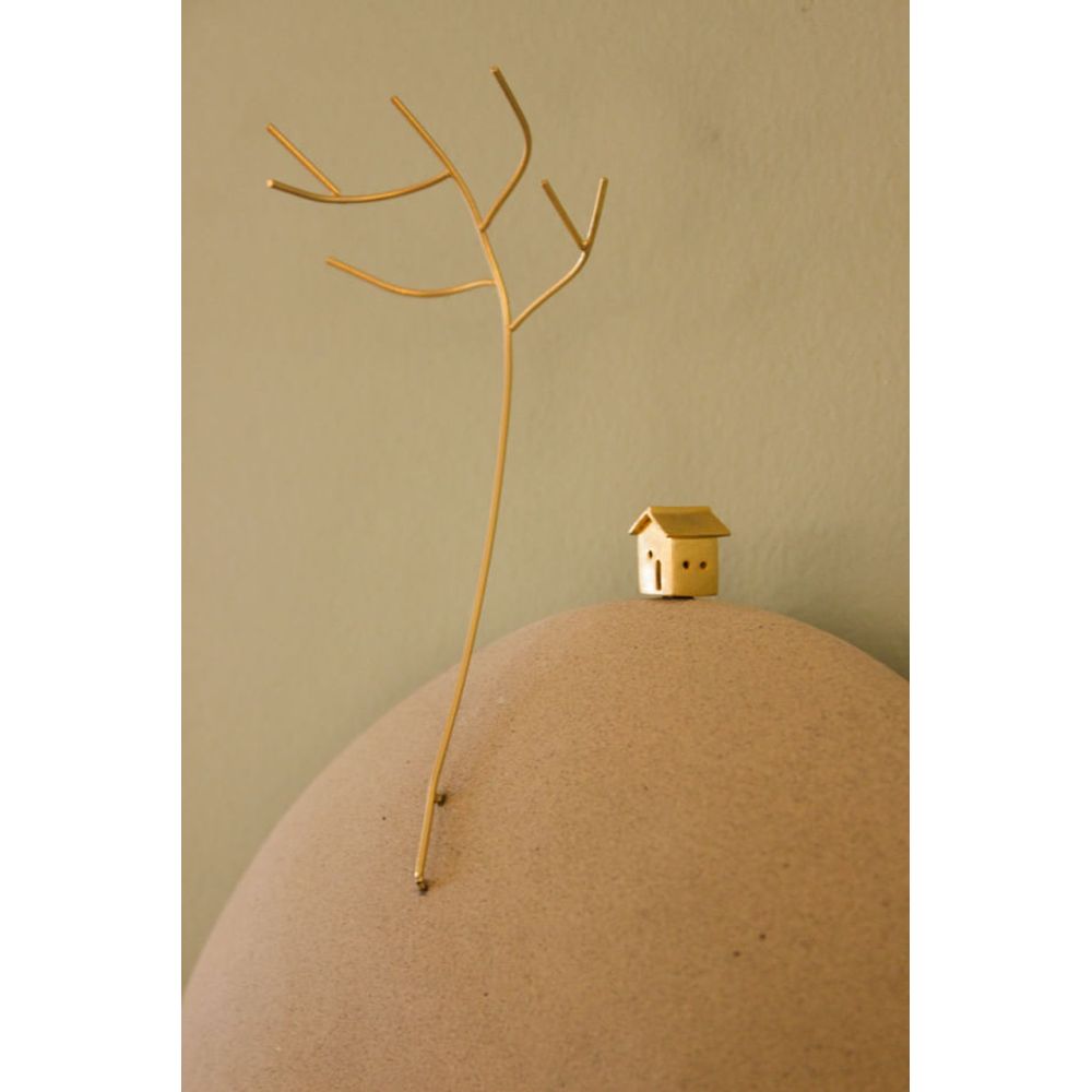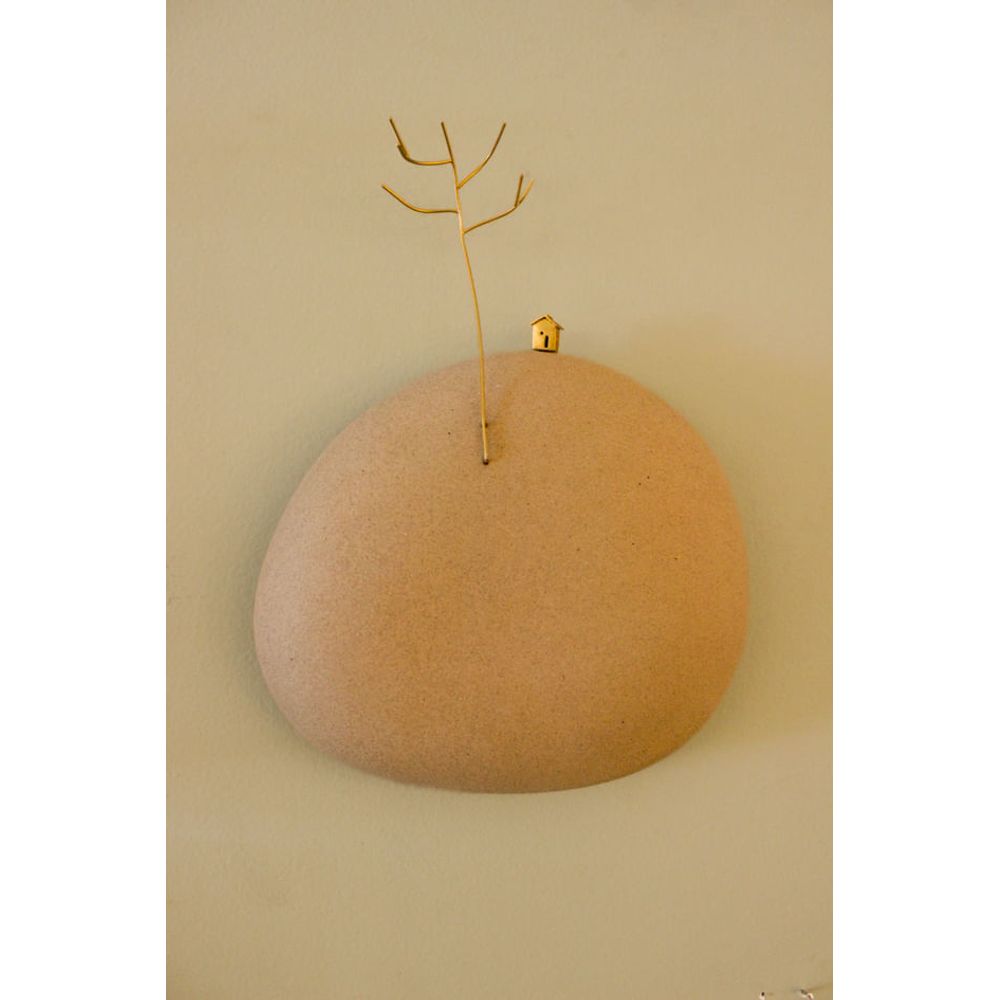 Escultura artesanal modelada com delicadeza e cuidado, o mundinho respiro é uma peça decorativa de parede criado em cerâmica natural formando uma pedra suave, com a miniatura de uma casinha e árvore de galhos finos, as peças são compostas por latão banhado a ouro, a obra artesanal transmite aconchego e simplicidade ao observar os pequenos detalhes, perfeito para transformar paredes com serenidade e beleza natural artística.