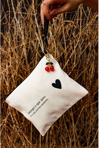 Uma necessaire charmosa e delicada, com a frase (Carrego o que amo), (e o que preciso também), feita em tecido resistente estampado com diversos mini corações em seu verso, transmitindo um toque afetivo perfeito para quem ama poesia, o destaque fica por conta do pingente com pequenas cerejas, adicionando delicadeza e cor para a necessaire, uma peça versátil para carregar com sigo. Acompanha o saquinho com uma tag de natal, adornada por pequenas berries natalinas, o presente que já chega prontinho, surpreenda com este belo mimo que encanta a todos em cada detalhe.