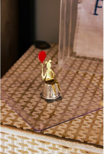 Mini escultura decorativa formada por um dedal, com uma menininha segurando um balão vermelho sentada em cima, feita de metal banhado a ouro 18k. Uma mini delicadeza que só poderia ser criação da Paty Fernandes, para você que gosta de decoração e poesia nos mínimos detalhes.
