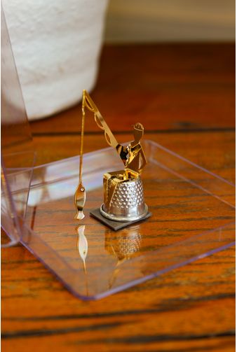 Mini escultura decorativa formada por um dedal, com um menininho sentado pescando em cima, feita de metal banhado a ouro 18k, com caixinha de acrílico. Uma mini delicadeza que só poderia ser criação da Paty Fernandes, para você que gosta de decoração e poesia nos mínimos detalhes.