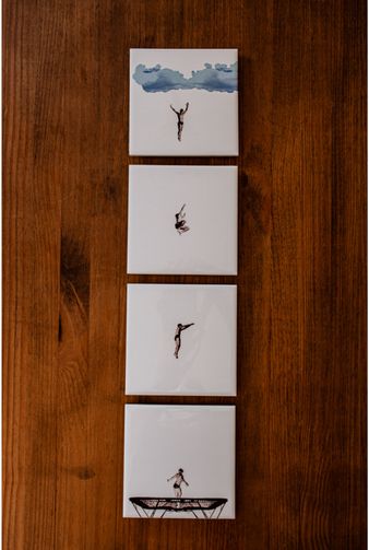Painel de azulejos composto por 4 peças. Greghi Design, em sua genialidade, preparou um painel com uma arte de um homem saltando numa cama elástica. Uma peça que nos diverte e provoca uma sensação instantânea de liberdade e incentivo ao "saltar alto". Será a estrela da sua parede, pode apostar!
