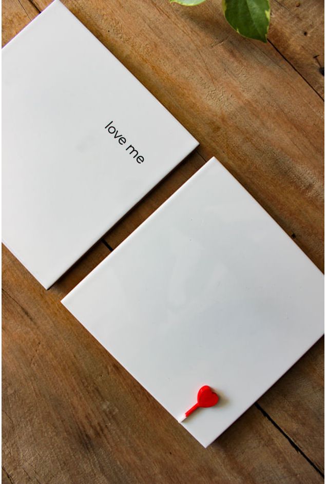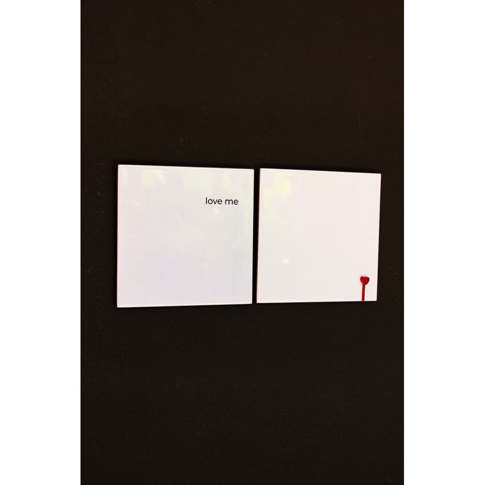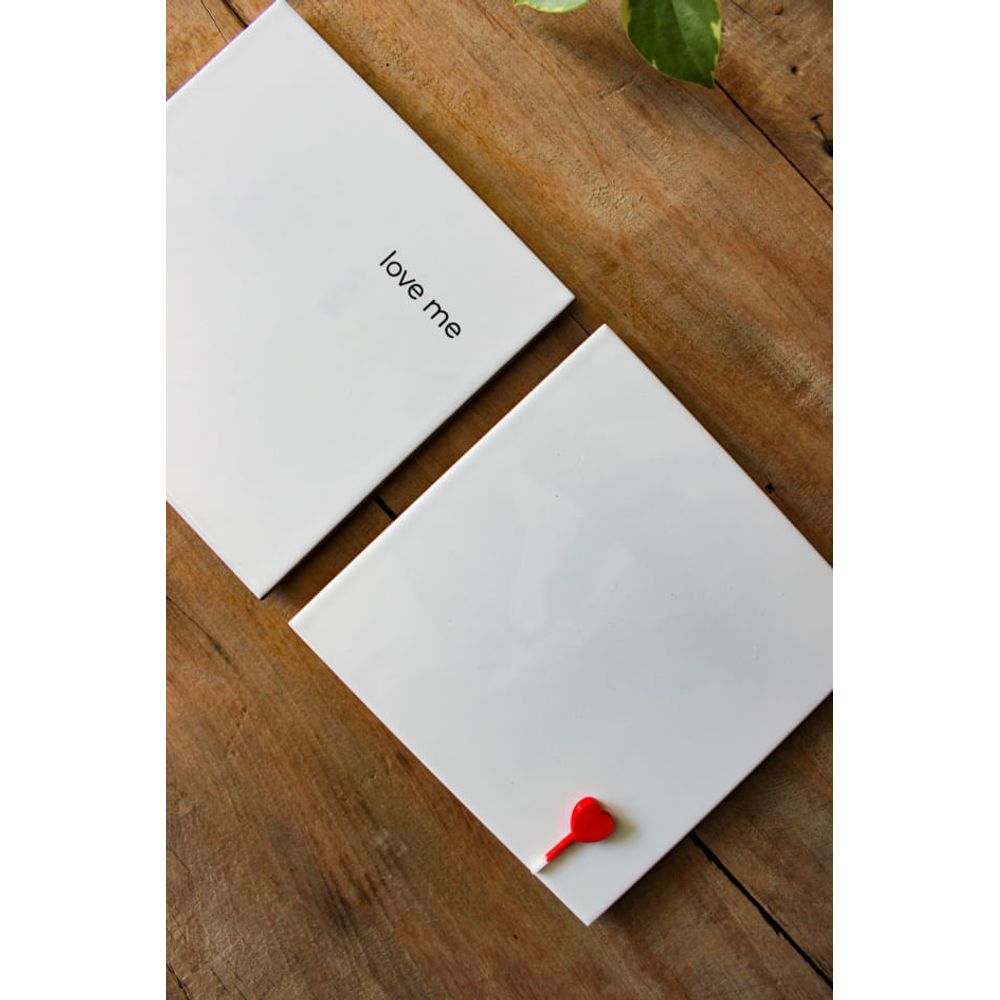 Painel de azulejos para pendurar na parede com toque minimalista e romântico, com a delicada frase (Love me), traduzida em (Me ame), escrito em um lado do azulejo, já no outro, o pequeno coração em aplique em vermelho intenso, as duas peças formam uma composição sensível, afetiva e cheia de charme. A decoração perfeita para espaços que celebram o amor em cada detalhe.