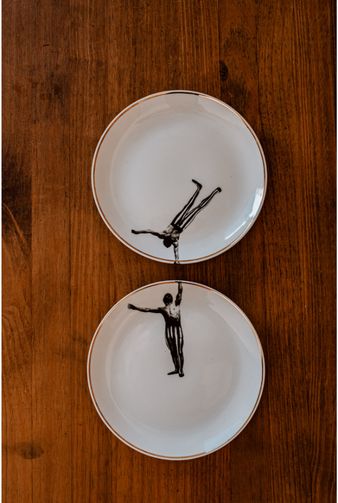 Painel de pratos decorativos formado por 2 peças ilustradas, que juntas provocam um sorriso instantâneo. A peça ainda recebe aplicação das artes do Greghi Design, e neste caso a imagem do equilibrista dando a mão à um parceiro, nos leva para cenas da vida real. Ou você não vive se equilibrando? Detalhe ainda para aplicação de filete em ouro 13k, entorno de todo o prato. As peças são acompanhadas de gancho para facilitar a instalação quando receber essa obra de arte. É só receber e instalar ;). Escolha esse painel para trazer design e irreverência ao seu ambiente. Não pensa muito, se jogue nesse painel.