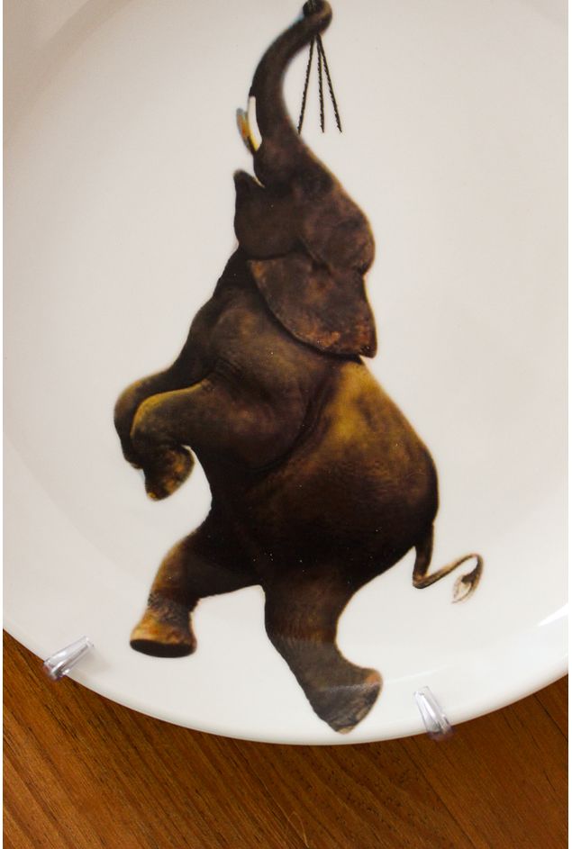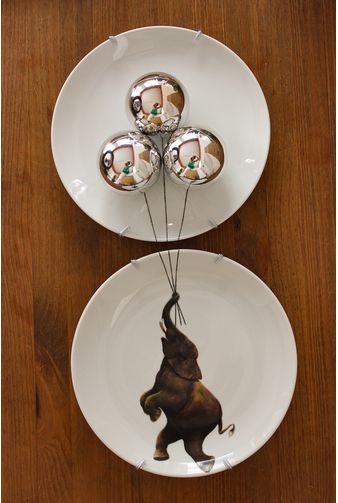 Painel de pratos decorativos formado por 2 peças em porcelana ilustradas, que são pura arte. Destaque para o artista Greghi Design que nesta nova coleção trouxe os bichos mais fofos pendurados por balões 3D, neste o elefante está pendurado por 3 desses. Uma combinação perfeita de decor irreverente + design + leveza + arte. Prepare-se, você vai se apaixonar!
