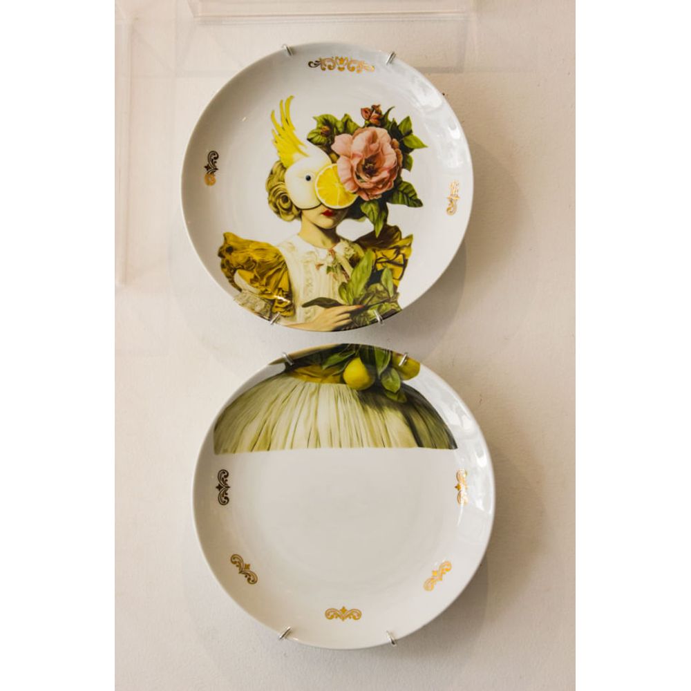 O painel de pratos menina cacatua é uma obra que entra em harmonia com a arte e poesia, formando a junção de dois pratos que completam a figura artística, adornada por flores e frutas em tons vibrantes e neutros que compõe a peça, sua borda contém detalhes em ouro, transformando-a em uma verdadeira obra artística.