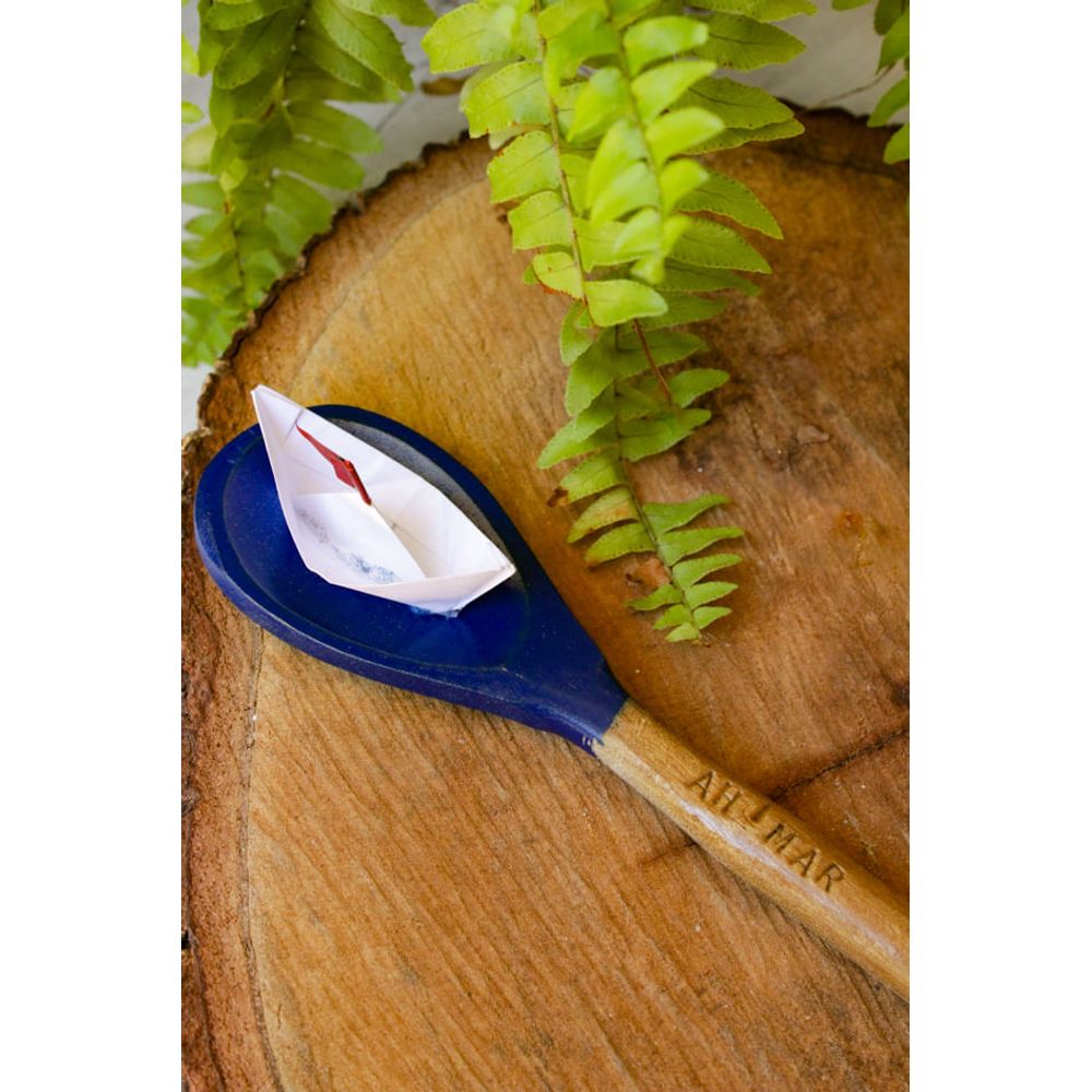 Colher de pau pintado na cor azul, com um barquinho e a gravação "AH! MAR".