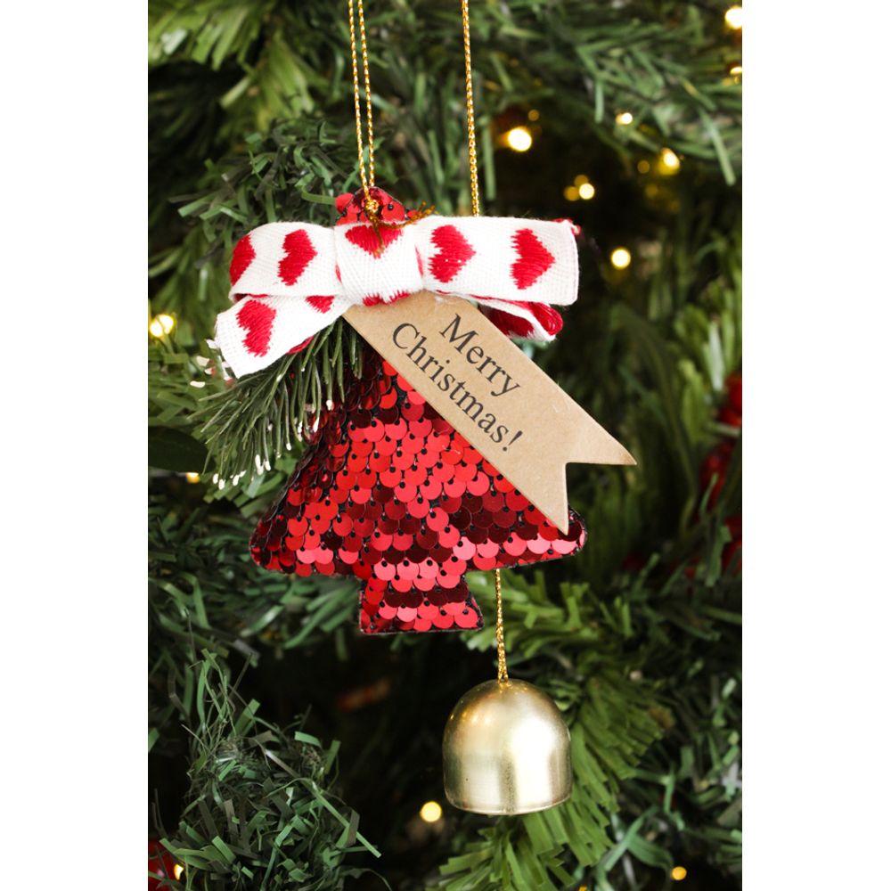 Decore com beleza e significado, o pingente de lantejola com sininho trás brilho e charme para a sua decoração, juntamente com um laço super fofo e a frase Merry Christimas!. Ideal para quem deseja uma decoração cheia de luz e alegria.