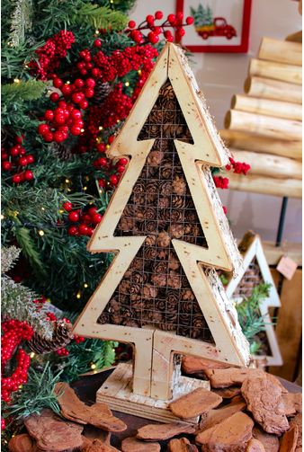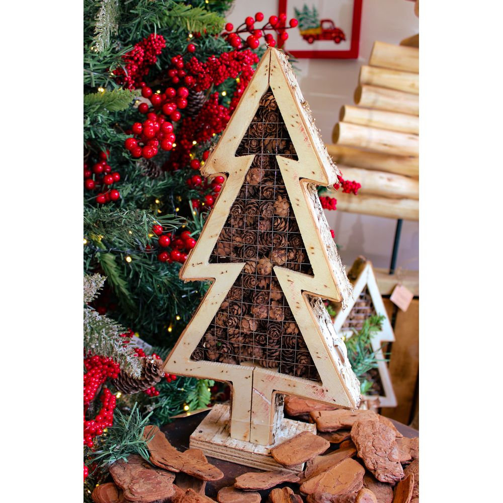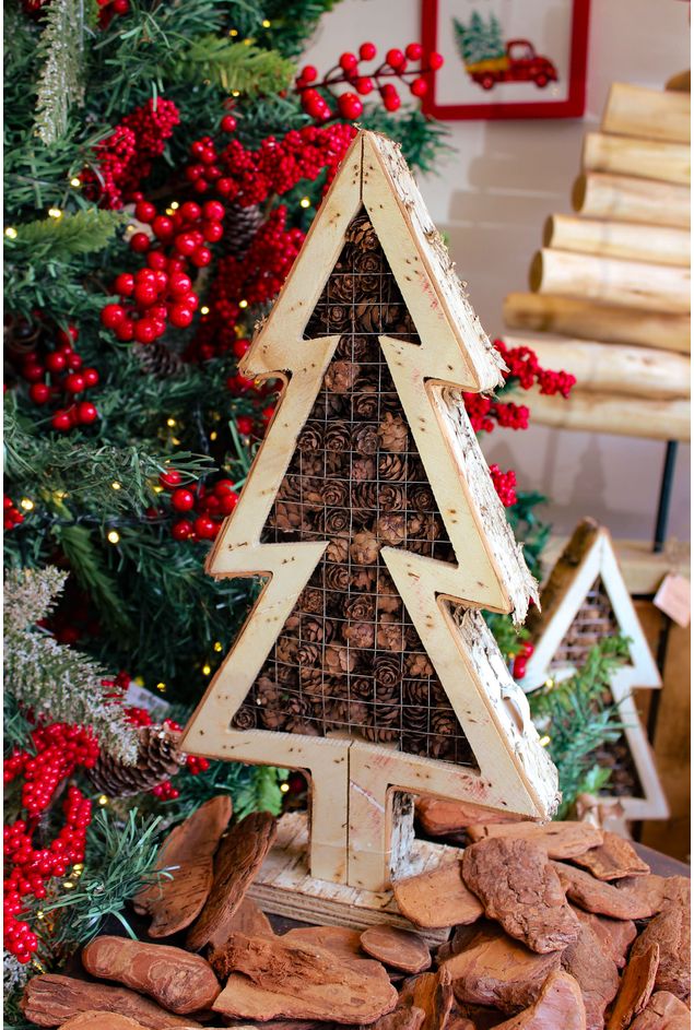 Pinheirinho decorativo feito de madeira, com o interior preenchido de pinhas, preso por uma gradinha. Para quem prefere um decor mais rústico, essa é a opção perfeita para compor a sua decoração, criando um espaço temático próximo a árvore,, por exemplo. Disponível em dois tamanhos para você compor um decor ainda mais completo!