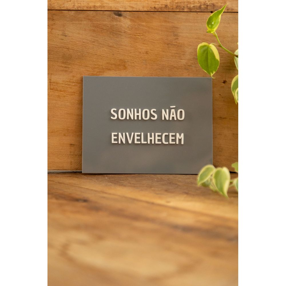A placa acrílica contém a frase (Sonhos não envelhecem) o fundo possui a cor cinza, destacando a frase aplicada em relevo no tom branco, criando um efeito 3d para a peça, a mensagem nos leva à reflexão da vida, uma frase inspiradora para compor ambientes.