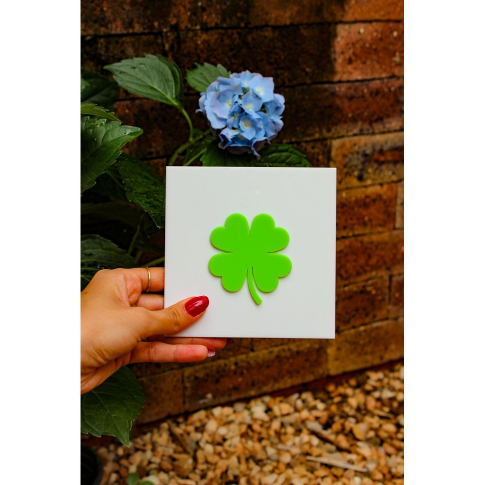 Placa acrílico trevo, contém a sua moldura em acrílico e no centro da peça o ícone do trevo de quatro folhas em verde vibrante remetendo ao símbolo da sorte, o fundo branco minimalista realça o design do trevo em 3d que também possui seu design em acrílico, transformando a obra em destaque para pessoas autenticas. A peça que faltava para compor o seu ambiente atraindo energias positivas.
