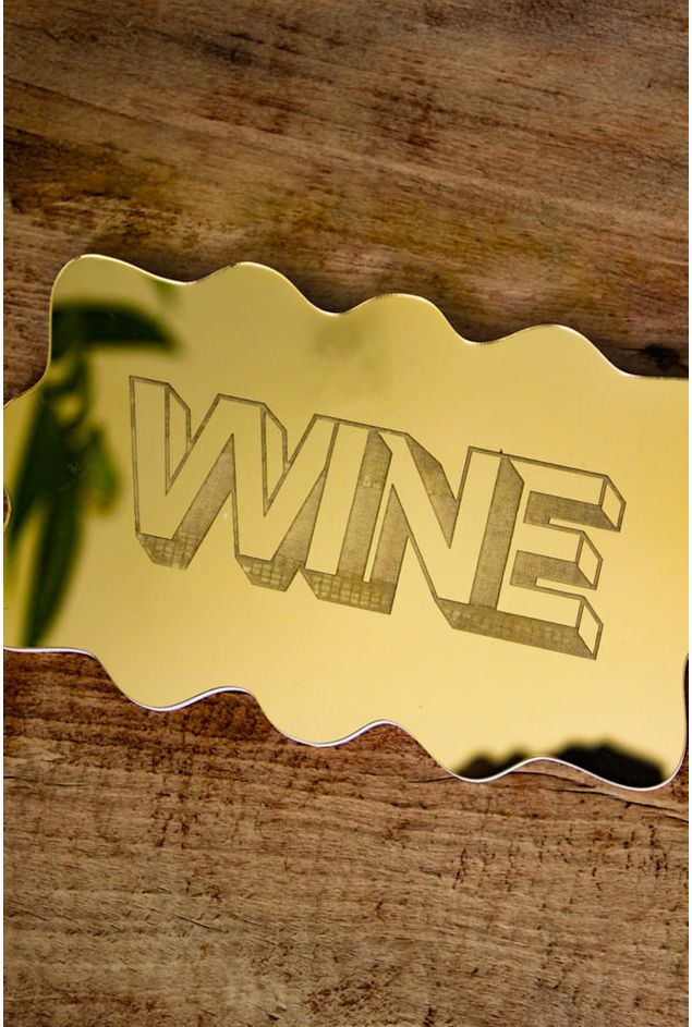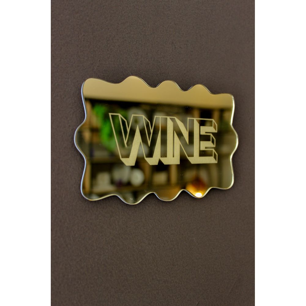 Placa decorativa espelhada em dourado, com a palavra (Wine), traduzida em vinho, uma peça moderna e cheia de personalidade para decorar com charme, sua borda com acabamento ondulado transforma a peça, reforçando o brilho e elegância que a peça transmite, seu design valoriza a decoração acrescentando um ar refinado para quem aprecia os detalhes.