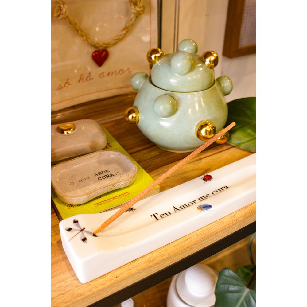 Porta incenso feito em porcelana, a peça ideal para momentos de bem-estar e energias positivas, no centro da peça possui a frase (Teu amor me cura), em sua volta pequenas figuras de insetos com detalhes tornam a peça mais atraente. Perfeito para decorar e energizar ambientes.
