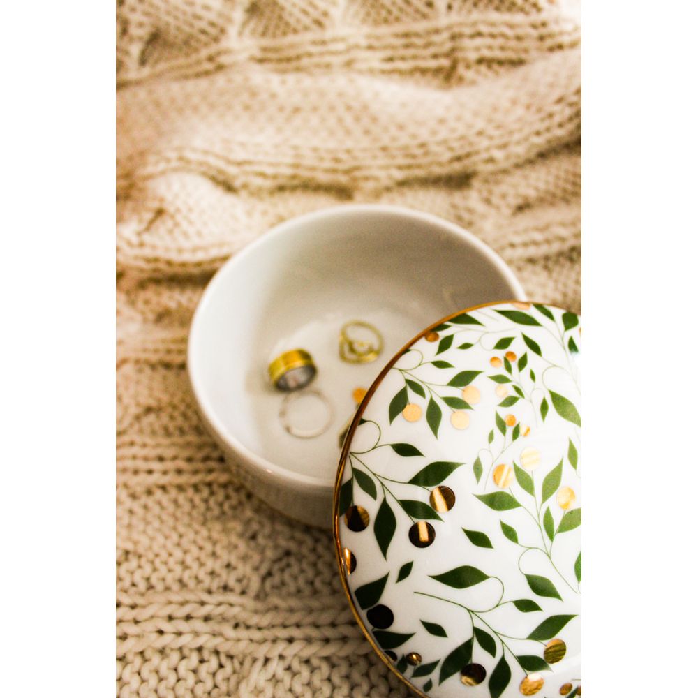 Porta-joias Gratidão Jardim Dourado. Uma peça que exala beleza, criada para guardar joias com beleza e cuidado. Com tampa estampada por folhagens em verde e detalhes com filete ouro, a composição traz leveza e sofisticação, perfeito para acomodar anéis, brincos e lembranças afetivas, tornando seu cantinho mais bonito e cheio de significado. A peça perfeita para presentear com afeto.