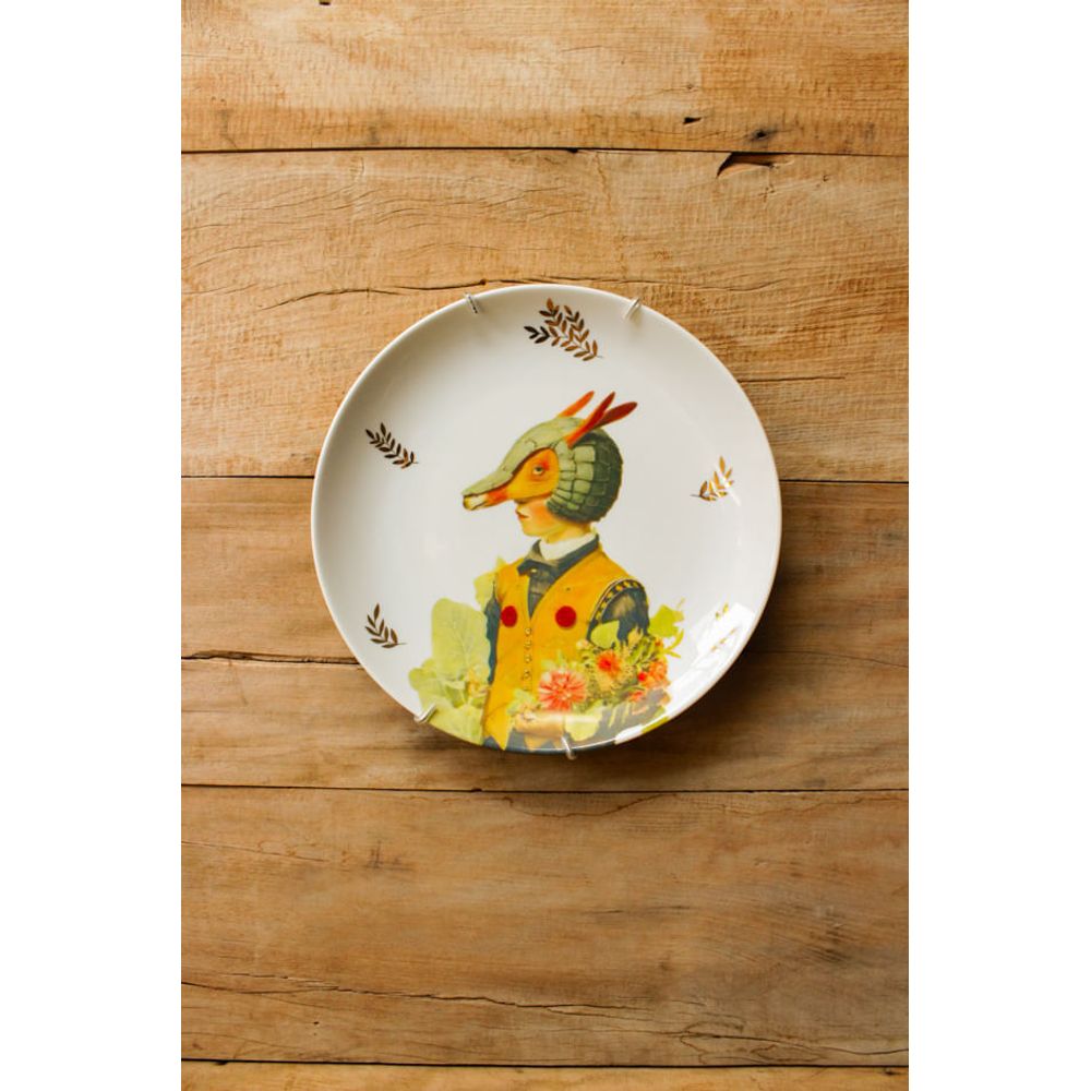 O prato decorativo menino tatu, é uma peça que une fantasia e elegância, sua borda possui pequenos detalhes em filete ouro, o retrato é de um jovem com máscara de tatu e traje contemporâneo, em sua volta contém folhagens e flores, nos levando a reflexão da peça. A arte se destaca em tons quentes, perfeito para decorar paredes com composição artística.