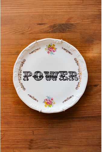 Prato decorativo de porcelana com design clássico Pomerode com bordas ornamentadas, com a palavra "Power" (poder), em fonte retrô circense, com bordas ornamentadas em dourado e delicados emaranhados de flores coloridas. Uma peça em um design clássico, empoderado e diferente para compor a sua decoração!