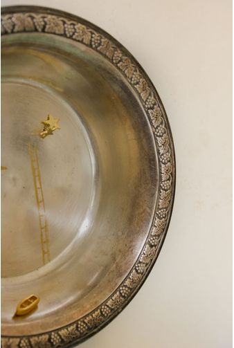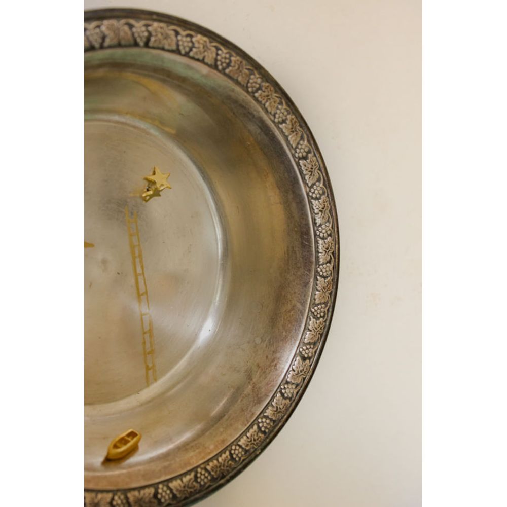 Obra exclusiva do Prato canoa céu estrelado, uma peça em prata garimpada à mão a tornando especialmente única, no centro da peça uma delicada canoa banhada a ouro repousa na peça abaixo do céu onde brilham a lua e as estrelas, juntamente com uma sutil escada evocando a travessia dos sonhos.