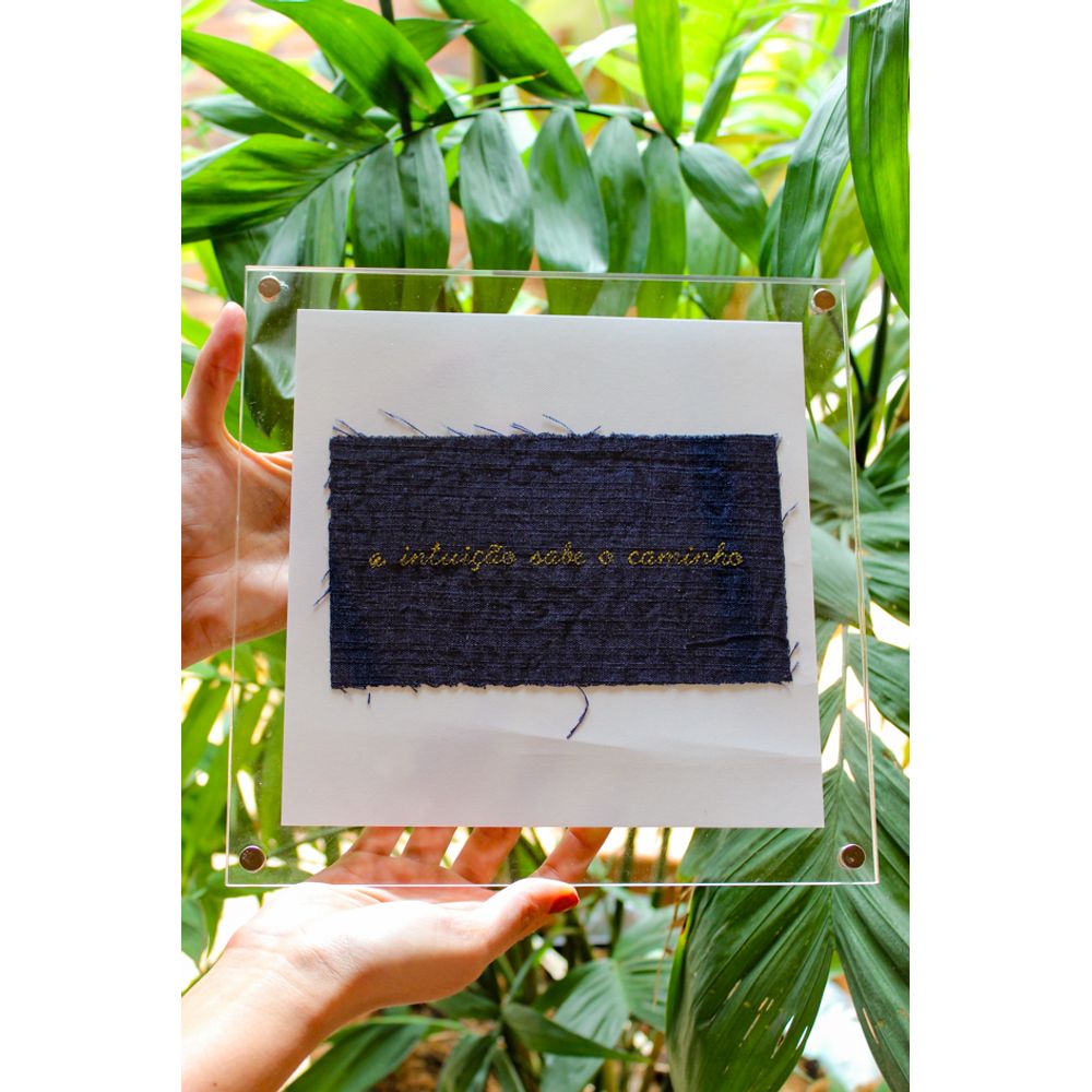 O quadro em material acrílico é uma peça cheia de detalhes que transforma decorações, combinando texturas com o tecido azul intenso bordado a mão com a poética frase em dourado que diz (A intuição sabe o caminho), uma mensagem que guia e inspira a traçar caminhos, uma peça artística e artesanal composta pelo tecido recortado e aplicado sobre o papel branco reforçado, pensada em transformar ambientes com leveza e levar a arte, ideal para pendurar na parede e criar combinações da forma que desejar.