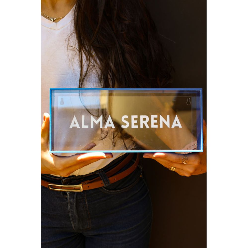 O quadro acrílico é composto pela frase (Alma serena), uma peça com moldura em tom de azul destacando a tipografia em branco com formato 3d, sobre o acrílico translucido, em seu verso contém suporte para fixar na parede, uma peça marcante que transmite leveza e calma, se adapta perfeitamente a espaços modernos, unindo o sofisticado com a inspiração da mensagem que carrega. Ideal para pendurar em paredes ou apoiar em estantes.