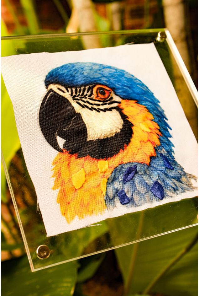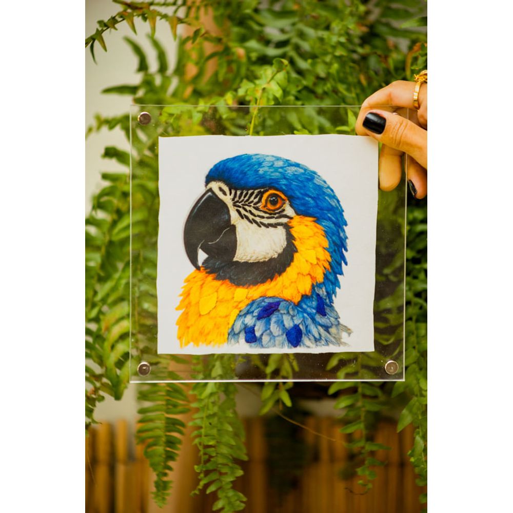 O quadro em acrílico estampa uma das aves mais belas do brasil, com a arara azul estampada em tecido, uma representação de riqueza, com cores vibrantes e delicado bordado nas penas amarelas, emoldurado no acrílico transparente, criando profundidade visual e destaque na parede.