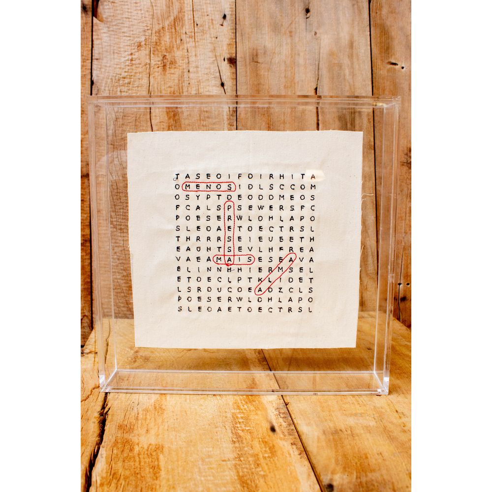 Quadro acrílico bordado feito no linho. Essa peça é um convite à contemplação. O caça-palavras bordado revela, entre letras e sutilezas, o que realmente importa: Menos pressa, mais alma. Para quem deseja lembrar, todos os dias, que a vida tem um outro tempo, mais inteiro, mais leve, mais nosso.