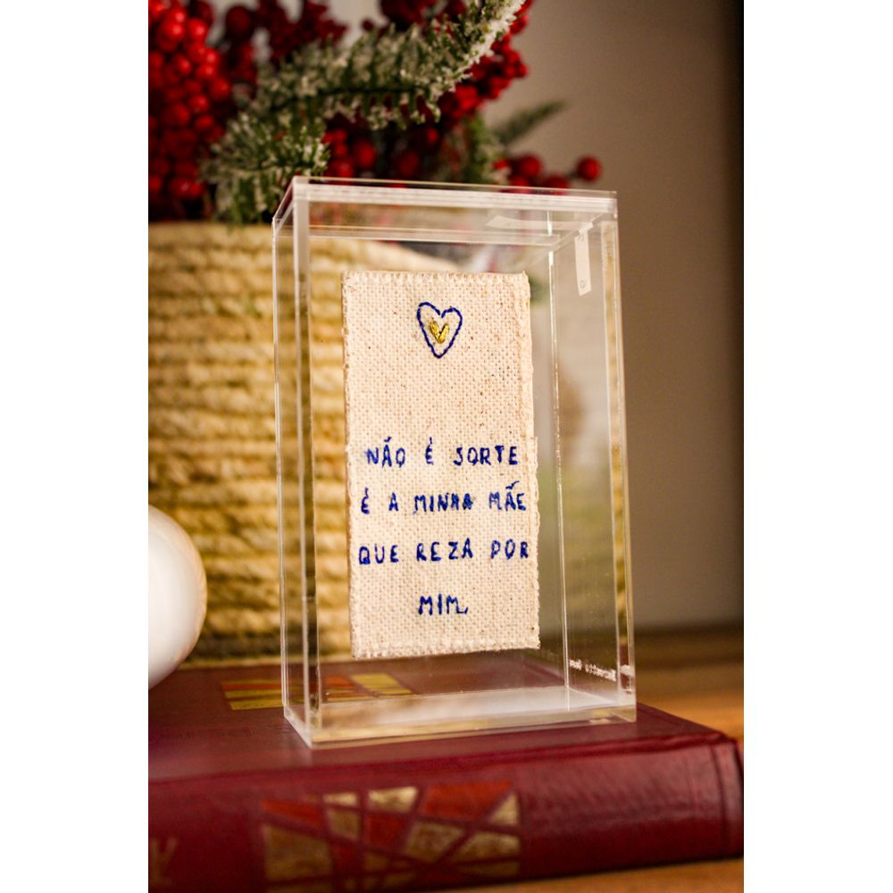 O quadro acrílico com a frase (Não é sorte é a minha mãe que reza por mim) é uma delicada peça que carrega devoção e fé, dentro da mini caixinha de acrílico o tecido com a frase bordada a mão se destaca pela delicadeza, acompanhado ao topo de um belo coração em azul e dourado, uma obra artesanal cheia de ternura e significado, a peça pode se tornar um presente super especial ou decorar paredes com muita gratidão.