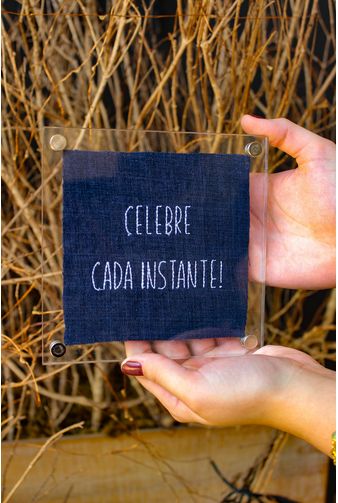 Quadro acrílico com a frase (Celebre cada instante), uma peça minimalista e elegante, que nos transmite a mensagem de valorizar os pequenos momentos da vida, o quadro contém o fundo em linho azul marinho escuro com a escrita feita em bordado com linha branca, o que destaca a mensagem, uma peça que combina textura e arte, perfeito para pendurar em paredes e compor decorações em estantes ou aparadores.