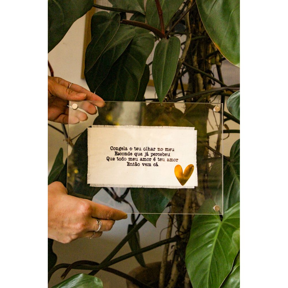 O quadro em acrílico é uma peça requintada completamente sofisticada, acompanhada da frase poética (Congela o teu olhar no meu), feita em bordado com traços finos, acompanhada de um belo detalhe de coração dourado no canto, o que torna a peça mais charmosa e elegante, um símbolo de amor e sentimento. Uma obra artesanal com design minimalista que carrega paixão e leveza, perfeita para decorar com sofisticação e amor em cada detalhe.