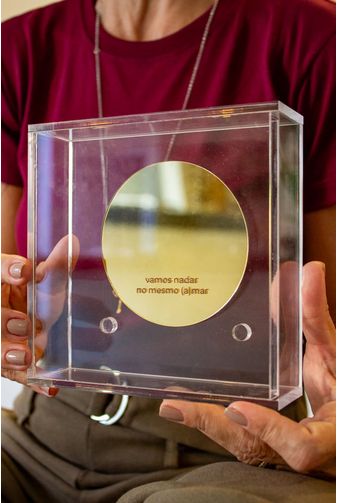 Com um disco em alumínio dourado protegido por uma caixa acrílica transparente, esta peça-objeto reflete o entorno, o olhar e a palavra, criando um jogo sutil entre presença e ausência, entre o visível e o que se sente.