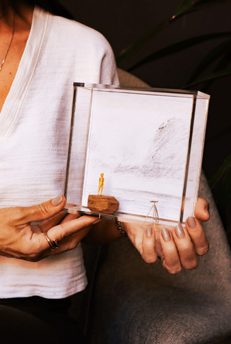 Quadro decorativo feito com moldura em acrílico, nascido em uma visita da Mimo ao novo ateliê da DZT, e inspirado nessa amizade e toda aquela atmosfera de arte. Esse quadrinho recebe fundo em papel markatto 250grs, com sketch de nuvens de 1899, com delicado aplique de um menino de metal banhado a ouro, em cima de um seixo sextavado feito de madeira e esculpido a mão. Do lado direito da peça, um telescópio banhado a ródio branco completa a peça, unindo a poesia das peças da DZT com o nosso amor por quadros em acrílico. E assim nasceu a coleção Encontros.