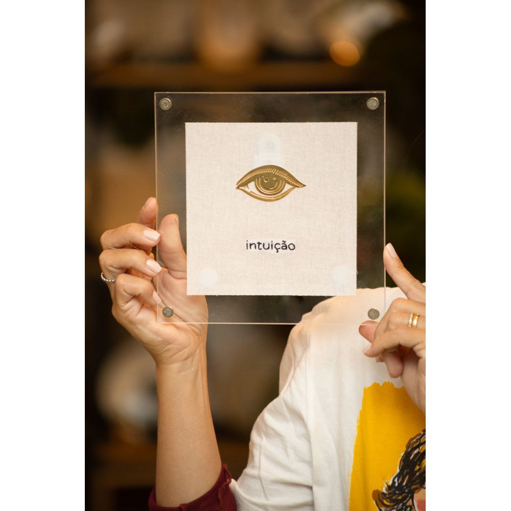 O quadro em material acrílico é uma peça que se destaca por seu design clean combinando com o tom dourado, a obra transmite serenidade e riqueza em detalhes, comtempla da palavra (Intuição), bordado em linha cor preto, aplicado sobre o tecido linho, acompanhada da figura de um olho sereno em metal cor dourado que reflete a luz, entregando muita presença e sofisticação para a peça artística, um detalhe que transforma a sua decoração, ideal para pendurar na parede e combinar com outras peças da mimo galeria.