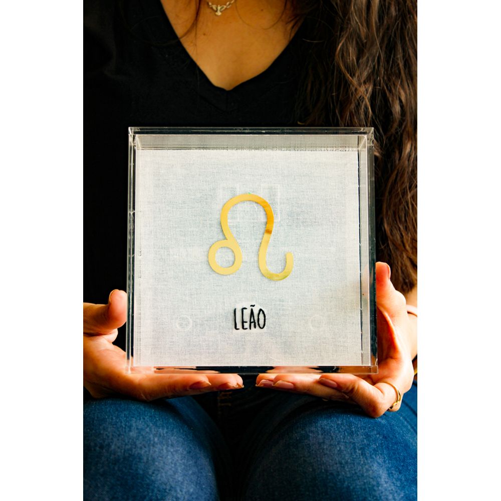 Com o símbolo feito em fotocorrosão banhada a ouro e bordado à mão, esta peça traduz o brilho natural e a confiança de Leão. O linho equilibra o dourado intenso, e o acrílico transparente destaca o símbolo com elegância. Um quadro para quem nasceu pra brilhar e ilumina cada canto com sua essência.