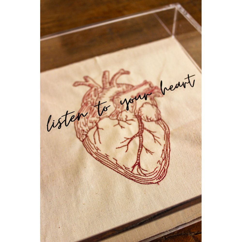 O mais belo quadro acrílico com a frase (Listen to you heart) traduzido em “escute seu coração” é uma delicada peça bordada a mão que inspira e encoraja, composta pela tipografia aplicada no acrílico que se destaca sobre o coração bordado em vermelho ao fundo, obra artística artesanal pensada em cada detalhe para abrilhantar a sua decoração, ideal para decorar a parede com design clean e que chama a atenção por seu destaque.