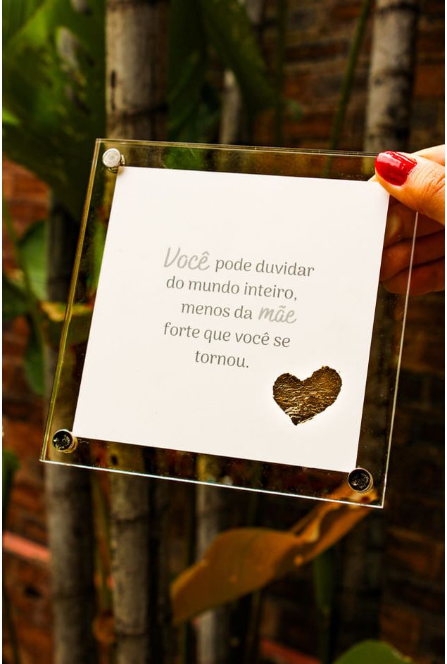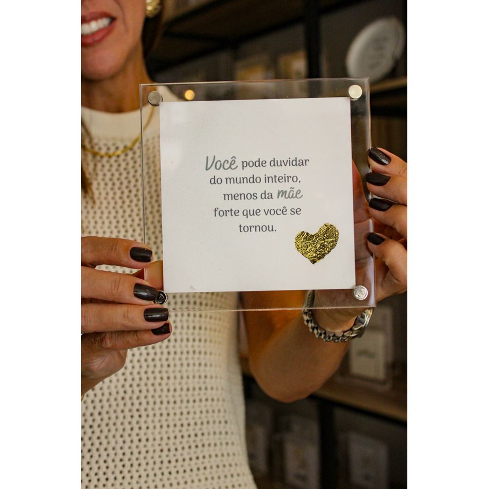Quadro em acrílico com a potente frase (Você pode duvidar do mundo inteiro, menos da mãe forte que você se tornou). Uma peça delicada e sofisticada, com moldura em acrílico transparente valorizando a delicadeza da peça e tornando a mensagem ainda mais especial. A arte impressa ganha destaque com o mini coraçãozinho em folha de ouro dourado, o que traz um detalhe sutil e atraente traduzindo afeto, força e admiração em forma de presente para aquela pessoa especial. Uma homenagem repleta de afeto para celebrar mães que inspiram com sua coragem, presença e amor.