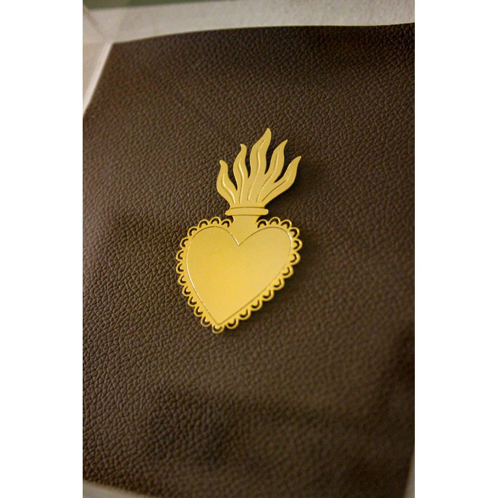 Uma peça intensa, que se destaca por seus detalhes que se unem em perfeita harmonia. O quadro em acrílico meu coração arde é uma peça requintada, com fundo em tecido couro no tom marrom escuro, destacando a figura do coração em dourado com detalhes rendados na borda e no topo uma coroa de chamas, um símbolo de amor em sua forma mais intensa, perfeita para irradiar ambientes decorando com poesia e afeto.