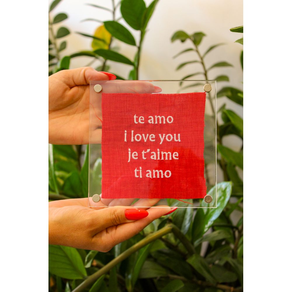 O quadro em acrílico o amor, é uma peça romântica com a demonstração de amor em diversas línguas, (Te amo – I love you – je t’aime – ti amo), um mimo repleto de afeto, com as palavras em bordado branco sobre o fundo em vermelho intenso de se apaixonar, obra artística feita para os apaixonados, uma peça desejada para receber com muito carinho ou pendurar na parede em uma composição romântica. Seu acabamento em acrílico protegendo a arte adiciona delicadeza para a composição.