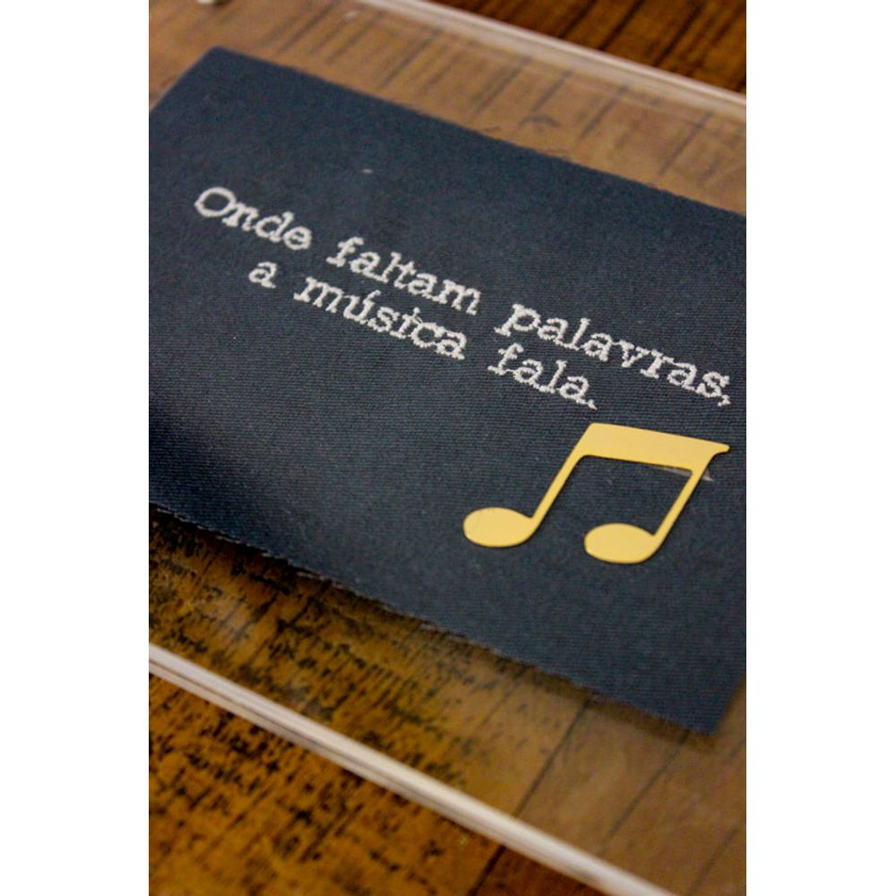 O quadro em acrílico nos traz a frase (Onde faltam palavras, a música fala) uma verdadeira peça poética, acompanhada do símbolo de uma nota musical em dourado que reflete a luz, a frase em bordado no tom branco se destaca no fundo azul intenso em tecido linho. A composição une música e poesia, perfeito para decorar ambientes com sensibilidade e estilo.