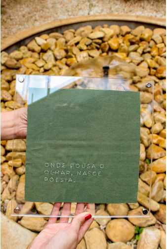 Uma linda peça feita em material acrílico, combinando texturas com o tecido bordado a mão, que contém a poética frase (Onde pousa o olhar, nasce poesia), a mensagem é escrita sobre o fundo em tom verde musgo, uma peça que carrega em si a arte poética, uma obra artesanal pensada em transformar ambientes com leveza e significado. A peça perfeita para decorar ou presentear alguém especial.
