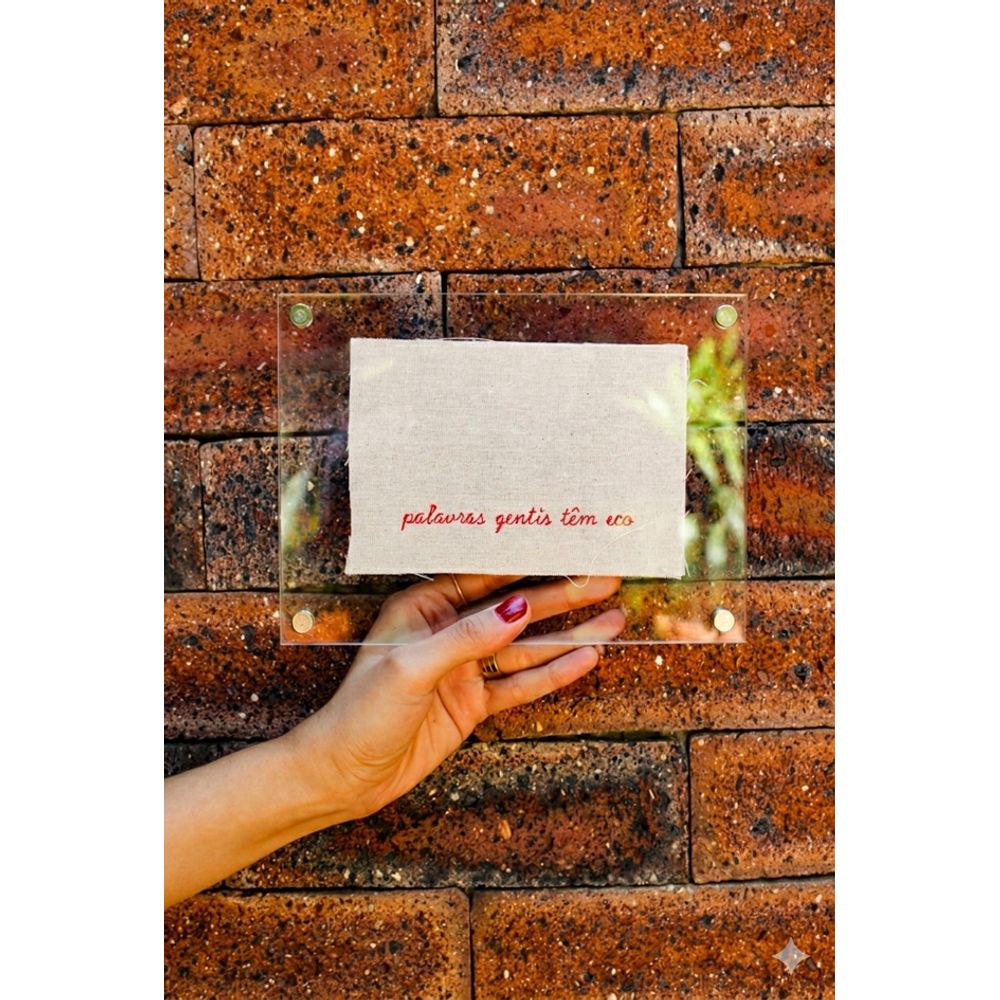 Quadro acrílico com a frase (Palavras gentis tem eco), bordada com delicados pontos em vermelho sobre o tecido cru em linho, a peça se destaca pela presença do vermelho e poesia que carrega, transmitindo leveza e propósito, seu design minimalista combina perfeitamente com diversos tipos de decorações, ideal para pendurar em paredes e demonstrar o que o ambiente reflete.