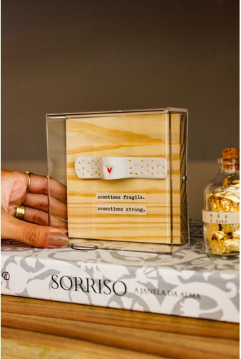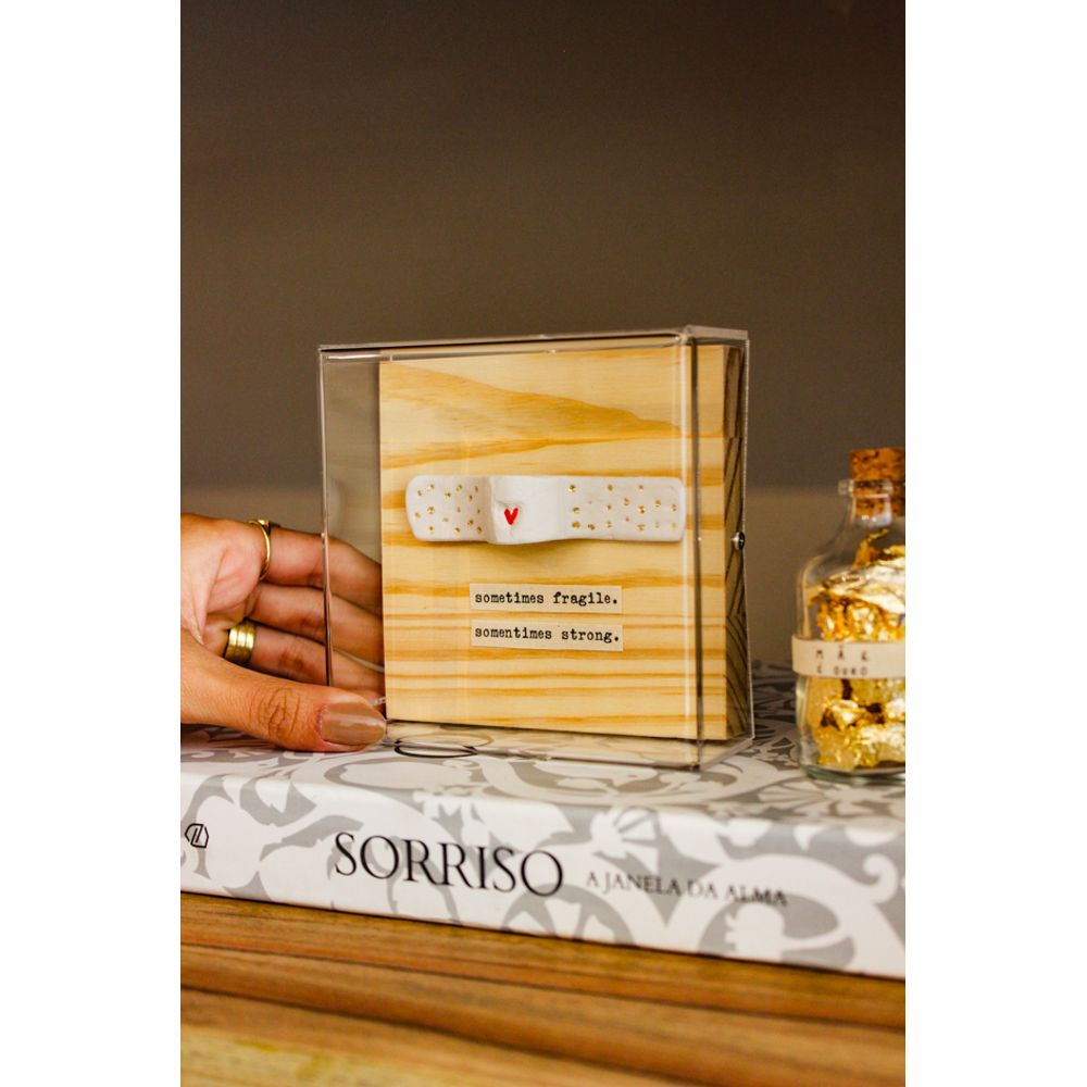 Uma peça artística repleta de ternura em cada detalhe, com base em madeira e proteção em acrílico transparente, a junção de materiais naturais e marcantes que transformam a peça com a frase (Sometimes fragile. Sometimes Strong), traduzida em (As vezes frágil, as vezes forte), o que se destaca é a figura de um curativo em argila, com detalhes em dourado e vermelho, uma obra moldada e pensada em cada detalhe para decorar ou presentear com arte e significado.