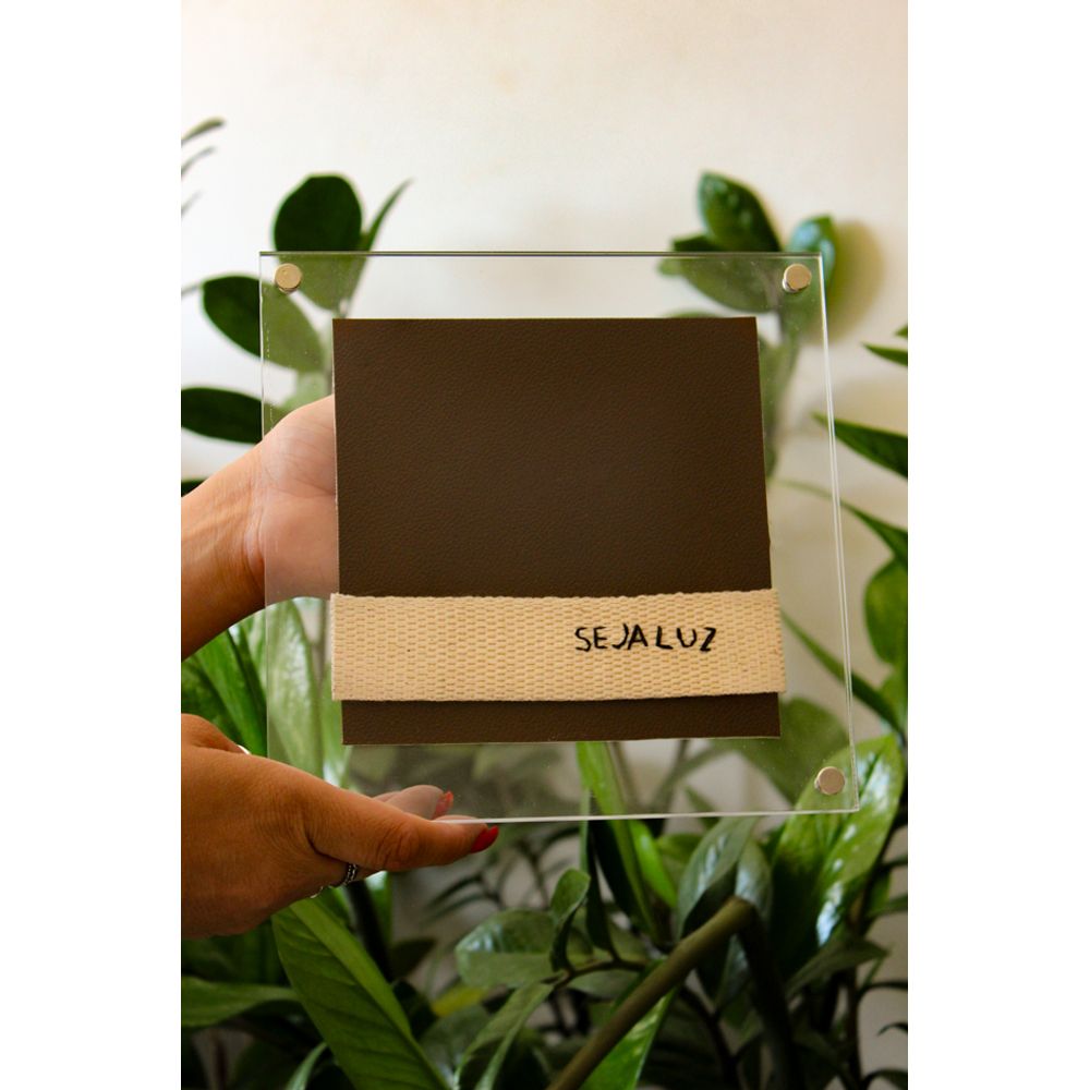 Quadro acrílico composto pela palavra seja luz, bordada em delicados traços sobre o tecido cru em uma faixa aplicada sobre o courino marrom que destaca a mensagem, uma peça delicada e inspiradora, a combinação que traz toda a riqueza das texturas para pendurar na parede com significado, o material em acrílico acrescenta o charme para a peça a tornando sofisticada e harmônica, aquele mimo para presentear alguém especial ou tornar a decoração mais elegante e poética.