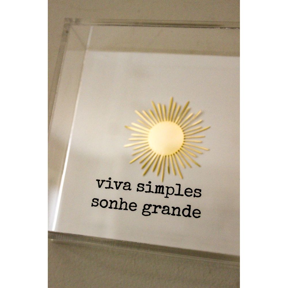 O quadro em material acrílico é uma peça que se destaca por seu design clean combinando com o dourado, a obra transmite leveza e riqueza em detalhes, comtempla da frase (Viva simples sonhe grande), aplicada em tom preto sobre o acrílico, já no fundo sobre o branco contém a aplicação de um sol raiando que revela muita presença em metal dourado refletindo a luz, um detalhe que transforma a peça acompanhada da mensagem inspiradora.