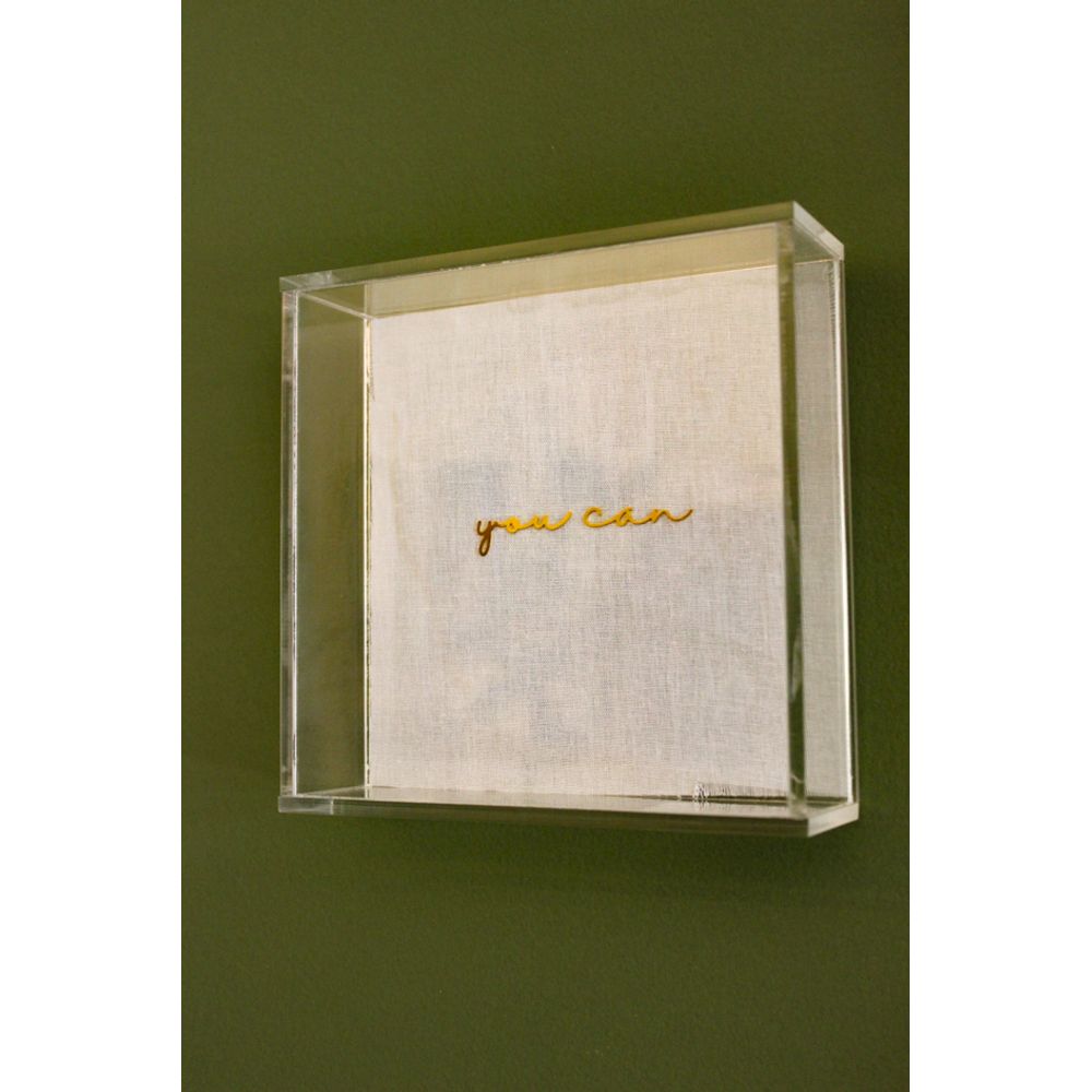 Uma peça com design clean e requintado, o quadro feito em material acrílico é composto pela frase (You can), traduzida em: “Você pode”, uma frase de impacto que se destaca em seu tom dourado que reflete a luz, no interior da caixa de acrílico sobre o tecido em linho neutro, uma obra artística e delicada repleta de sofisticação que nos leva a reflexão da mensagem que carrega, peça perfeita para decorar paredes e criar combinações por seu design ser versátil unindo tons perfeitos para composições.