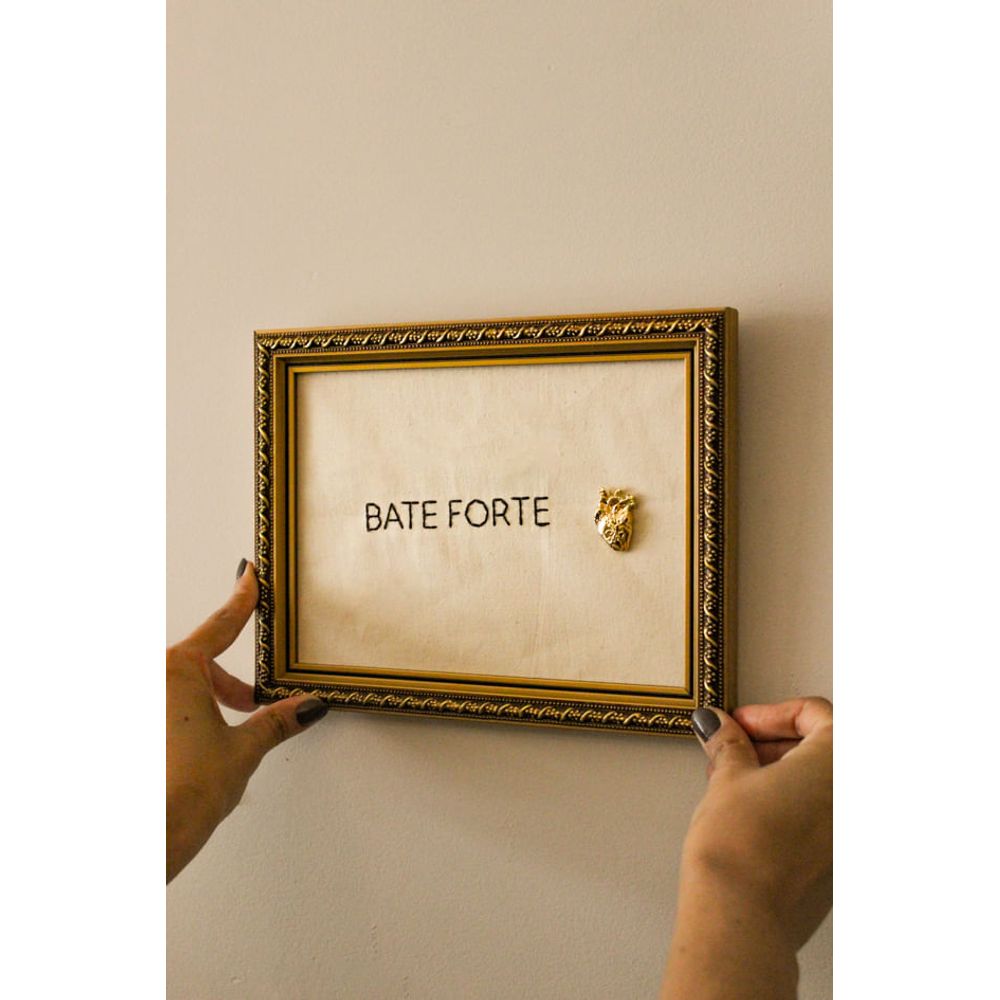 Quadro decorativo que desperta beleza e admiração, com a moldura ornamentada rica em detalhes, e tecido bordado, com a frase (Bate forte), a peça decorativa que transforma poucas palavras em uma mensagem cheia de intensidade, criando um contraste delicado entre emoção e sofisticação. Perfeito para ambientes que valorizam peças artísticas e elegantes, ou presentear alguém especial.