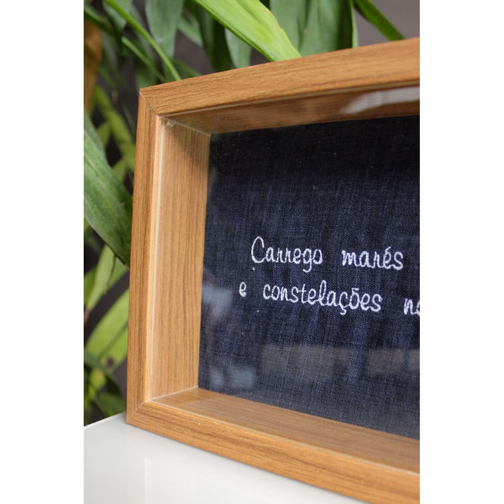Quadro decorativo emoldurado em madeira mdf, nos revelando uma peça rústica combinando com poesia, o quadro carrega a frase (Carrego marés no peito e constelações nos passos) sobre o tecido em azul intenso com a frase bordada a mão em linha branca, uma peça que se destaca em ambientes acolhedores e tranquilos, ideal para pendurar na parede, apoiar em estantes ou prateleiras, uma obra artística artesanal que nos traz intensidade e inspiração.